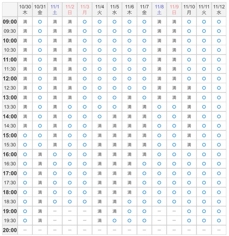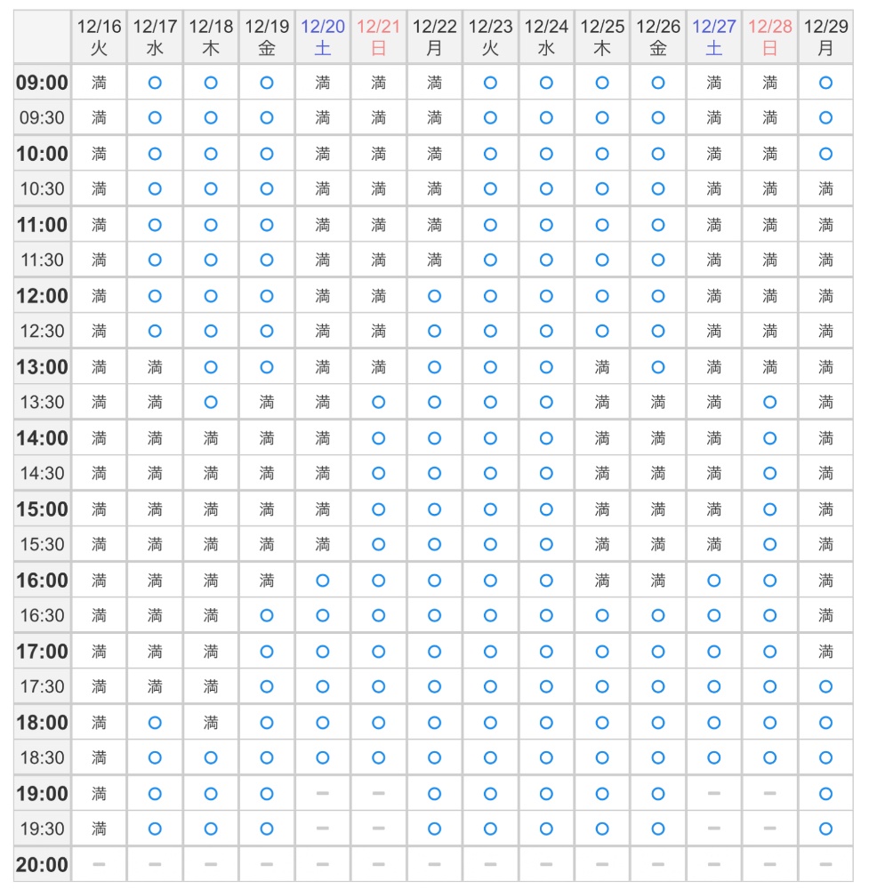 オンライン予約で表示される予約表のスクリーンショットです。エキテンのアカウントがなくても閲覧できる様に掲載していますが不定期更新となります。